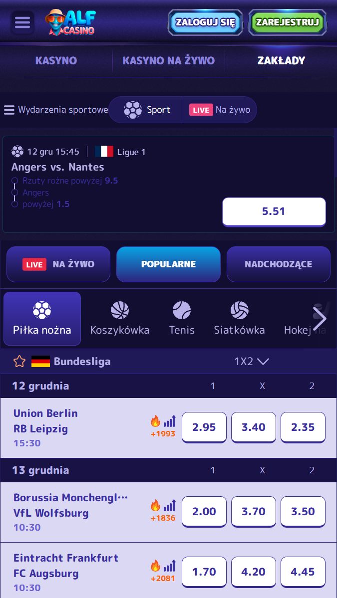 Oprócz gier kasynowych AlfCasino przygotowało także sekcje z zakładami przedmeczowymi na żywo. Możesz obstawiać wyniki wydarzeń z ponad 20 różnych dyscyplin. Także takich popularnych, jak: