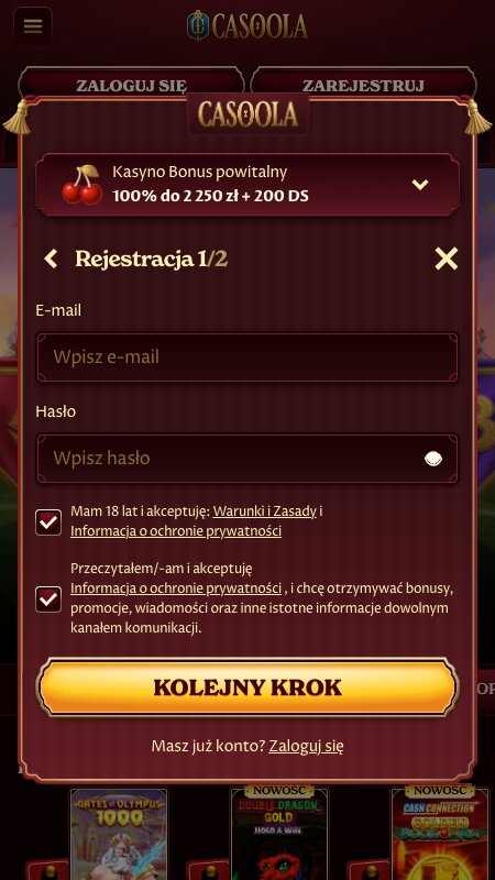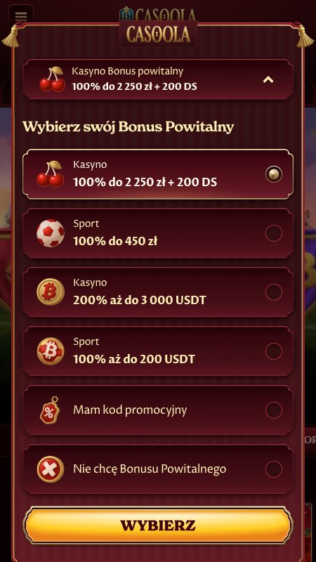 Nie jest dostępny kod promocyjny Casoola. Wszystkie bonusy otrzymasz poprzez rejestrację z naszego odnośnika.