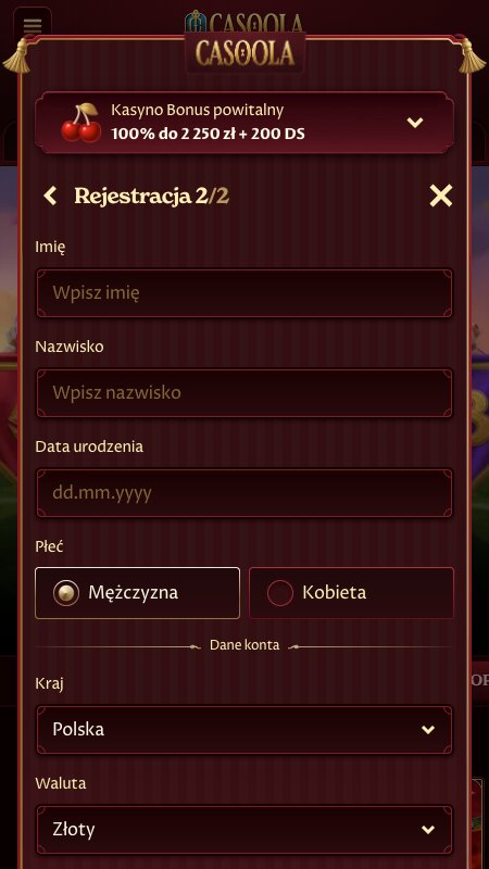 Kasyno Casoola postawiło na prosty formularz. Wymaga podstawowych danych, co przekłada się na szybką rejestrację. Potrzebujesz około 2 minut, aby założyć konto i grać. Postępuj według poniższych wskazówek, aby dokonać pierwszego logowania: