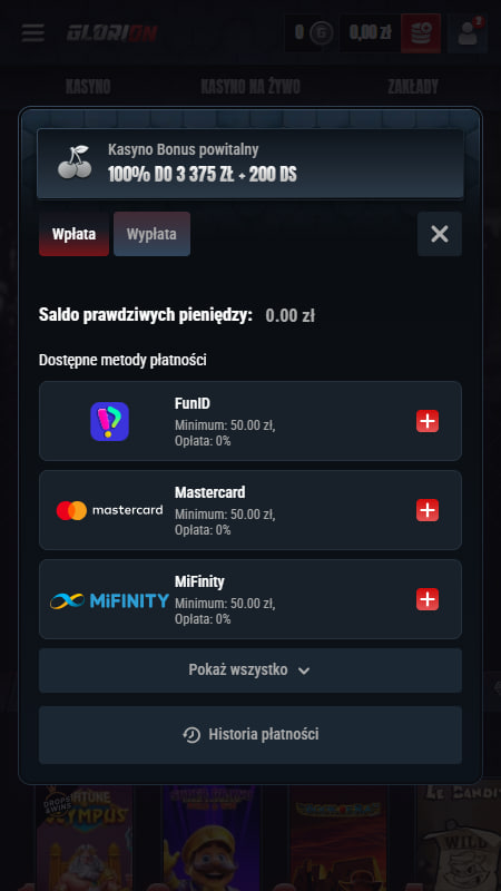 Obsługiwanymi metodami płatności przez kasyno Glorion są FunID, Mastercard, VISA, MiFinity, kryptowaluty oraz przelewy bankowe. Brakuje BLIKA, Skrilla oraz Netellera.