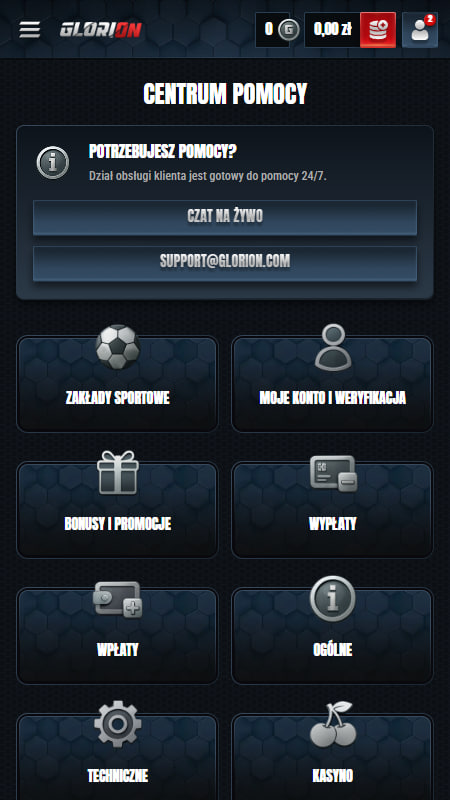 Obsługa klienta w kasynie Glorion jest dostępna całodobowo. Skontaktujesz się poprzez czat na żywo lub adres e-mail. Wsparcie jest realizowane także po polsku, ale z wykorzystaniem automatycznego tłumaczenia, co nieco obniża poziom rozmowy. Niemniej jednak pomoc jest wyjątkowo szybka. Czas oczekiwania na konsultanta na czacie nie przekracza 1 minuty.