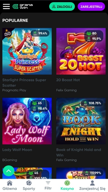 Kasyno GranaWin korzysta z najwyższego dostępnego współczynnika zwrotu dla gracza. Sprawdziliśmy kilkadziesiąt automatów hazardowych, w tym Sugar Rush, Gates of Olympus, Sweet Bonanza, Big Bass Bonanza i każdorazowo potwierdziliśmy, że zwrot dla gracza jest najwyższym deklarowanym przez producenta. Dlatego też średnie RTP w tym kasynie wynosi około 95.50%, a w sekcji ze slotami online 96.00%. W katalogu znalazło się nawet miejsce dla automatu Book of 99 od Relax Gaming, gdzie RTP wynosi rekordowe 99.00%.