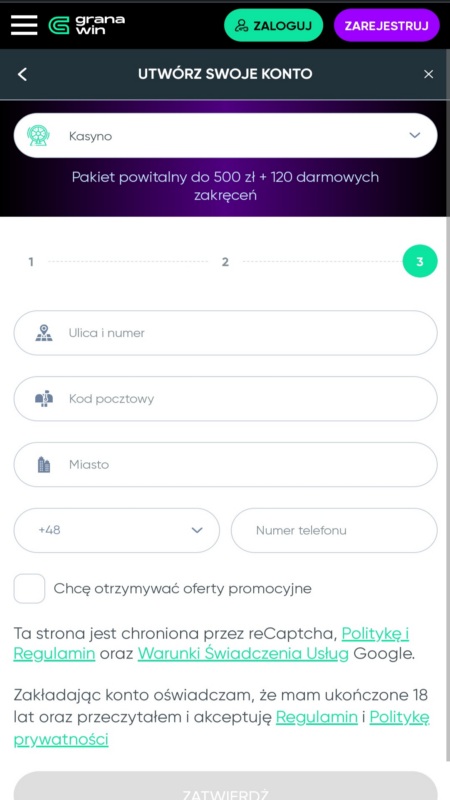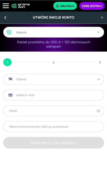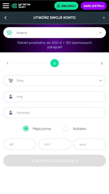 GranaWin przygotowało formularz rejestracyjny, w którym musisz podać podstawowe dane, aby założyć konto gracza. Rejestracja trwa maksymalnie 2 minuty. Postępuj według poniższych wskazówek.