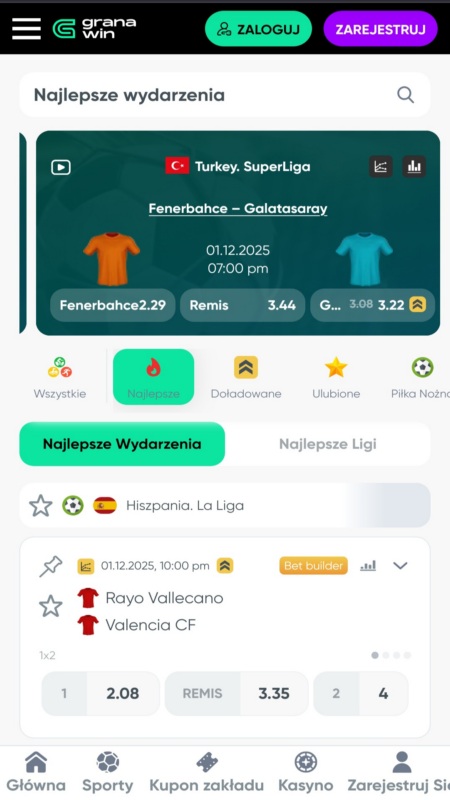 GranaWin pozwala typować także polskie rozgrywki, w tym Ekstraklasę i niższe poziomy, żużlową Ekstraligę, siatkarską PlusLigę oraz Basket Ligę. Brakuje zakładów na KSW.