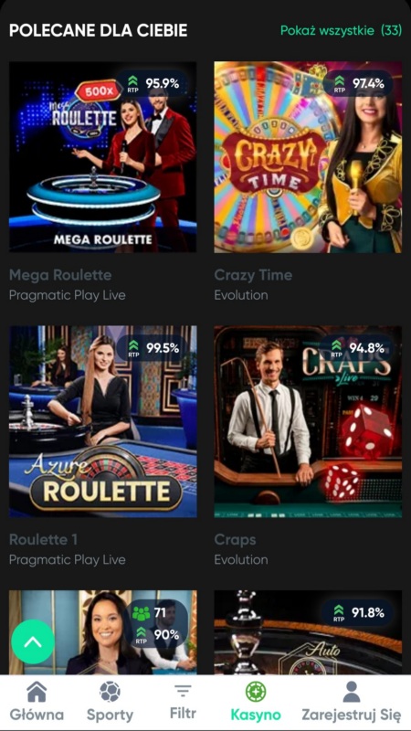 | 👨 Gry na żywo | 1100+ | Crazy Time, Deal or No Deal | 94.50% |