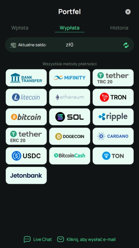 | Tron | 49.890045 TRX | 250 zł | 2000 zł | Do 24 godzin |