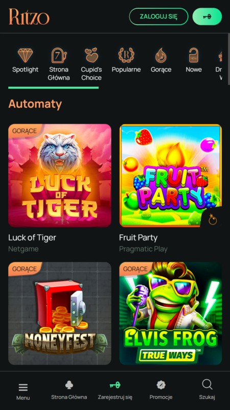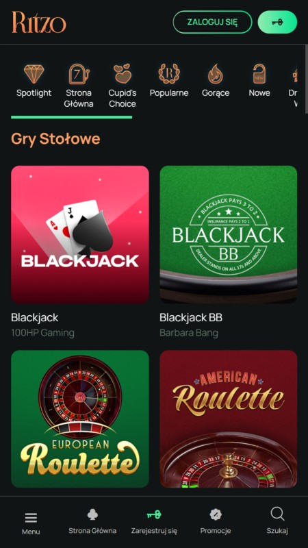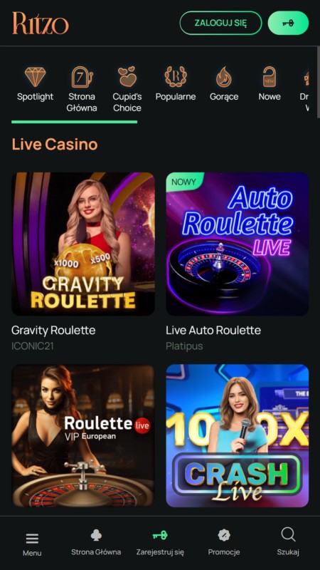 Ritzo Casino przygotowało ponadprzeciętny katalog, składający się z ponad 16000 różnych gier hazardowych. W portfolio znajdują się zarówno sloty online, gry stołowe, ale także gry crash i krupierzy na żywo.