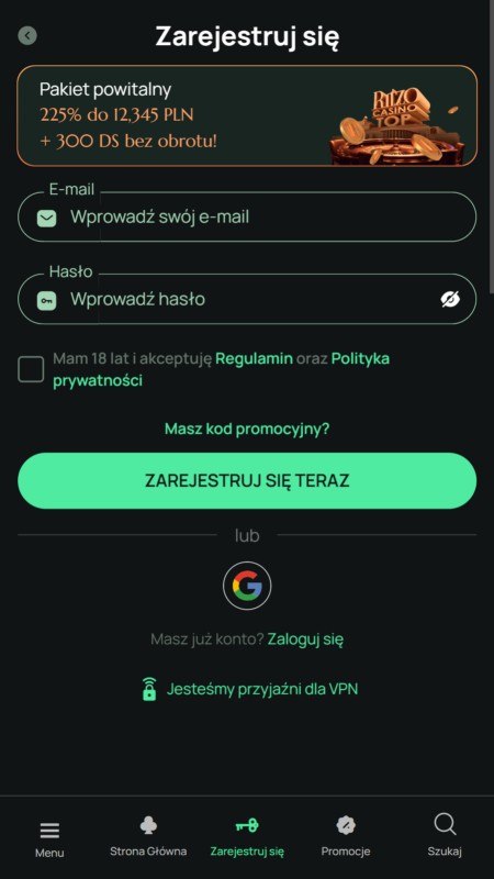 W kasynie Ritzo rejestracja polega na wypełnieniu formularza lub autoryzacji poprzez konto Google. Wystarczy zaledwie 1-2 minuty, aby dopełnić wymaganych formalności i grać.