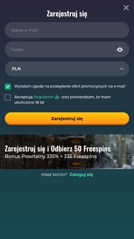 Kliknij przycisk “Zarejestruj się” na samym dole okienka. Po chwili zostaniesz automatycznie zalogowany. Będziesz mógł odebrać bonus i grać.