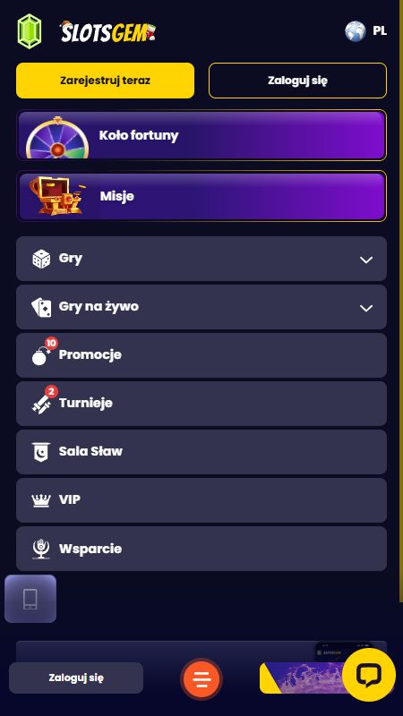 Kasyno Slotsgem wydało aplikację w wersji PWA (progresywna aplikacja internetowa). Możesz ją dodać do ekranu swojego urządzenia mobilnego, a następnie korzystać z dopasowanej wersji za pomocą przeglądarki. Aplikacja mobilna bazuje na podobnym układzie i motywie, co strona główna. Zapewnia jednak dodatkowe skróty u dołu ekranu, pozwalające na szybsze poruszanie się po pełnej ofercie kasyna Slotsgem.