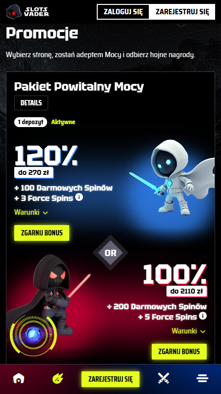 Pakiet powitalny składa się maksymalnie z 10550 zł oraz 1105 darmowych spinów. Przy każdym z trzech pierwszych depozytów SlotsVader daje możliwość wyboru bonusu Jasnej lub Ciemnej Mocy, który wiąże się z innym rodzajem oraz wartością promocji. Od pierwszego depozytu możesz też aktywować Bonus Highroller, o czym dalej za chwilę.