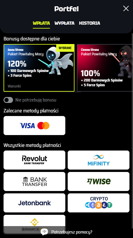 Na liście obsługiwanych metod płatności znajdziesz: BLIK, VISA, Mastercard, Revolut, MiFinity, Wise, przelewy, Jetonbank oraz kryptowaluty.