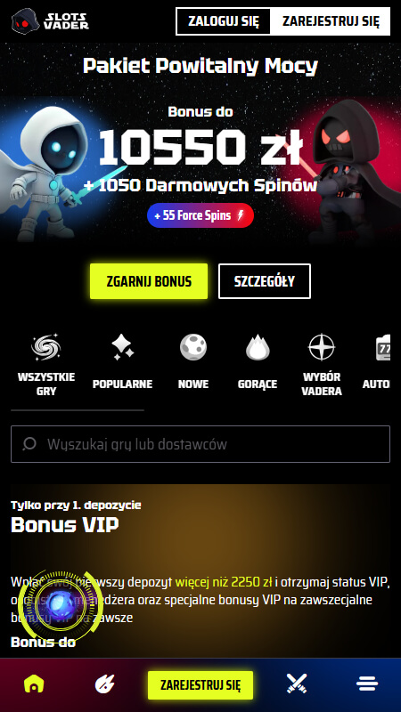 SlotsVader to kasyno online, które wyróżnia się okazałym bonusem powitalnym do 10550 zł i 1050 darmowych spinów oraz bogatą ofertą ponad 7500 gier (w tym także wielomilionowymi jackpotami sieciowymi). Dużymi atutami są również szybkie wypłaty (do 2 dni roboczych), wygodne doładowania BLIKIEM i codzienne promocje dla zarejestrowanych graczy.
