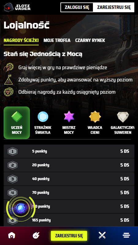 SlotsVader Casino przygotowało też program lojalnościowy. Składa się ze 100 poziomów, a awanse uzyskasz za swoją aktywność, zbierając punkty lojalnościowe. Czekają na Ciebie ekskluzywne bonusy, darmowe spiny oraz wiele innych ofert.