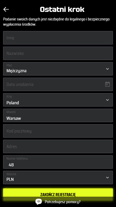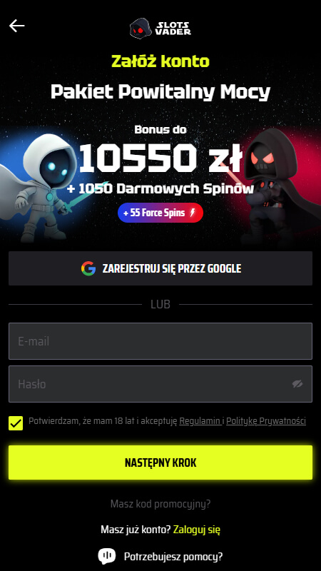 Rejestracja w SlotsVader Casino jest wyjątkowo prosta. Trwa około 2 minut. Nie musisz weryfikować tożsamości, aby rozpocząć grę.