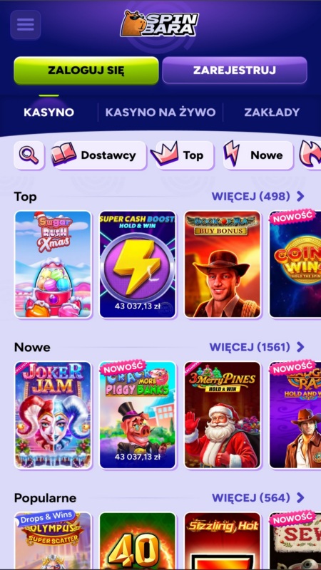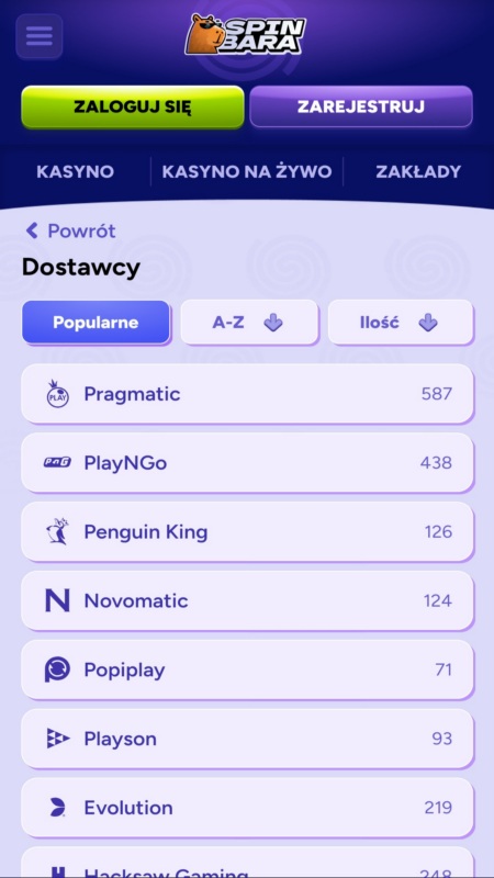 Spinbara współpracuje z blisko 100 dostawcami gier. Na tej liście na wyróżnienie zasługują takie tuzy hazardu, jak Pragmatic Play, NetEnt, Nolimit City, Hacksaw, Novomatic oraz Playson.