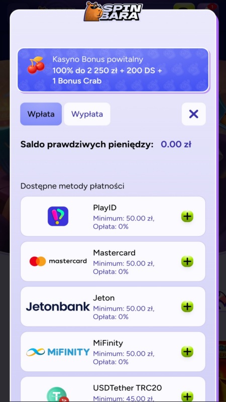 Obsługiwanymi metodami płatności w kasynie Spinbara są PlayID, Mastercard, Jeton, MiFinity, kryptowaluty oraz przelewy bankowe (także na rachunek Revolut).