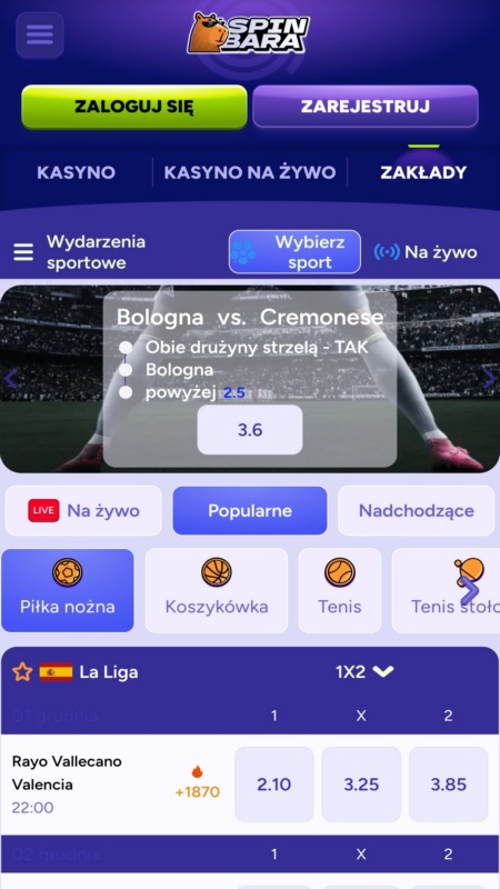 Spinbara oferuje zakłady także na krajowe rozgrywki – Ekstraklasa i niższe ligi, siatkarska PlusLiga, Polska Liga Koszykówki, żużlowa PGE Ekstraliga i nie tylko. Oferowane są także dodatkowe funkcje, w tym cashout, Early Payout, BetBuilder oraz darmowe transmisje.