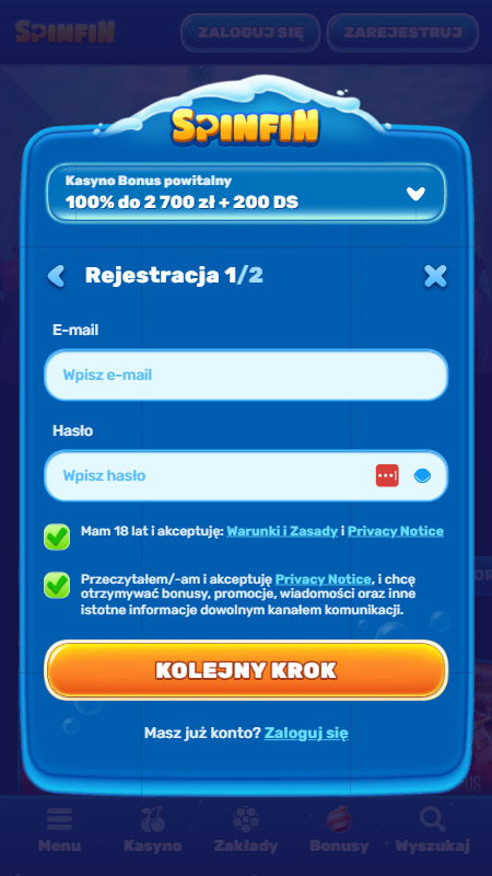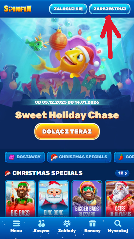 Przejdź do kasyna SpinFin, a następnie w prawym górnym roku kliknij “Zarejestruj”.