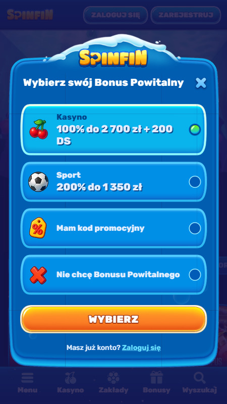 💡 Jaki otrzymam w kasynie SpinFin bonus na start?