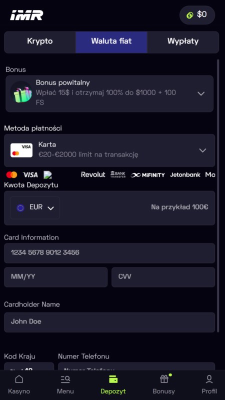 Immerion Casino zapewnia pełne wsparcie dla kryptowalut, ale jednocześnie obsługuje także sporo tradycyjnych metod płatności, obejmujących również karty i przelewy bankowe. Nie są jednak dostępne doładowania BLIKIEM. Pełną listę metod sprawdzisz w tabeli.