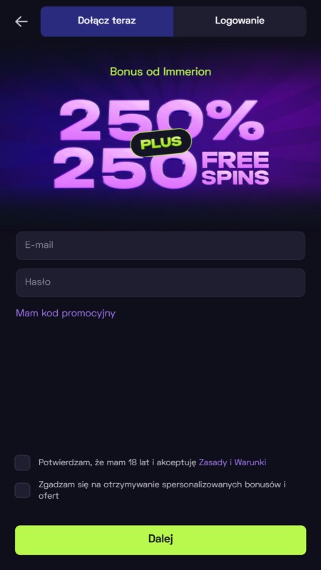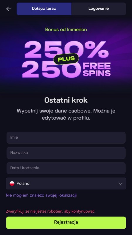 Rejestracja bazuje na tradycyjnym formularzu. Immerion Casino skrócił go do minimum formalności, a więc wystarczy podać e-mail, hasło i podstawowe dane osobowe. Czas potrzebny do założenia konta gracza wynosi poniżej 2 minut. Oto szczegóły krok po kroku: