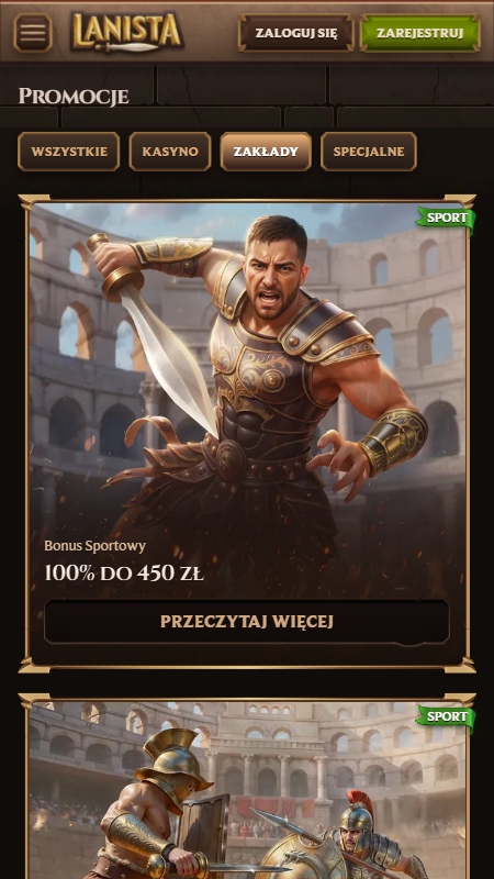 Lanista to nowy bukmacher dla polskich graczy, który swoje wirtualne bramy otworzył w październiku 2025 roku. Oferuje zakłady na wszystkie popularne dyscypliny, w tym polskie rozgrywki. Dla nowych graczy przygotowany został bonus powitalny o wartości 100% do 450 złotych. Możesz skorzystać także z cashoutu, wczesnej wypłaty, podwyższonych kursów i innych ofert. Jego znakiem rozpoznawczym są również darmowe transmisje wideo.