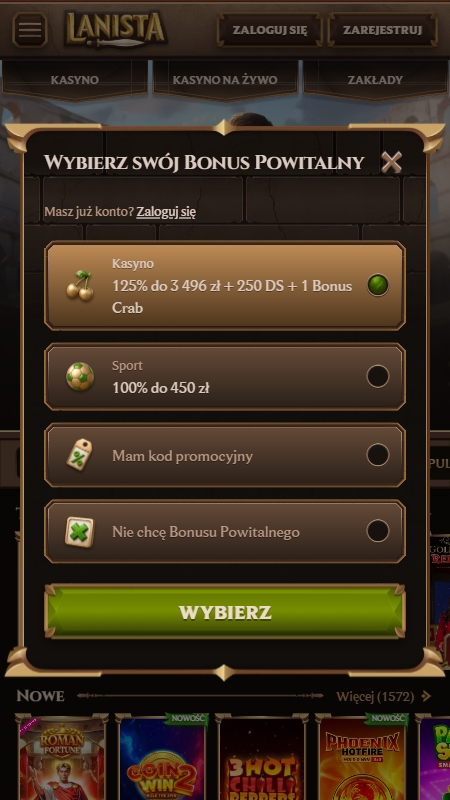 Lanista przygotował też dedykowany bonus powitalny na kasyno, z którego możesz skorzystać zamiennie z bonusem bukmacherskim. Wynosi on 125% do 3496 złotych, 250 darmowych spinów i 1 Bonus Crab.
