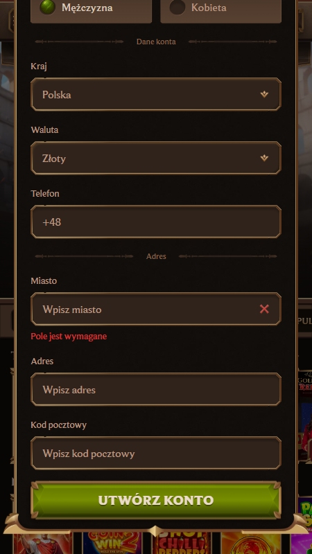 Uzupełnij szczegółowe dane, w tym imię i nazwisko, datę urodzenia, adres zamieszkania, numer telefonu oraz wybierz płeć, kraj i walutę, w której chcesz obstawiać. Kliknij “Utwórz konto”, a po chwili zostaniesz zalogowany.