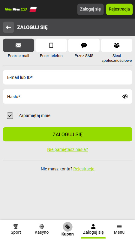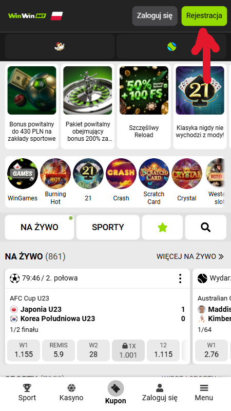 Przejdź na stronę bukmachera WinWin, klikając link w naszym tekście, a następnie na załadowanej stronie kliknij zielony przycisk “Rejestracja”.